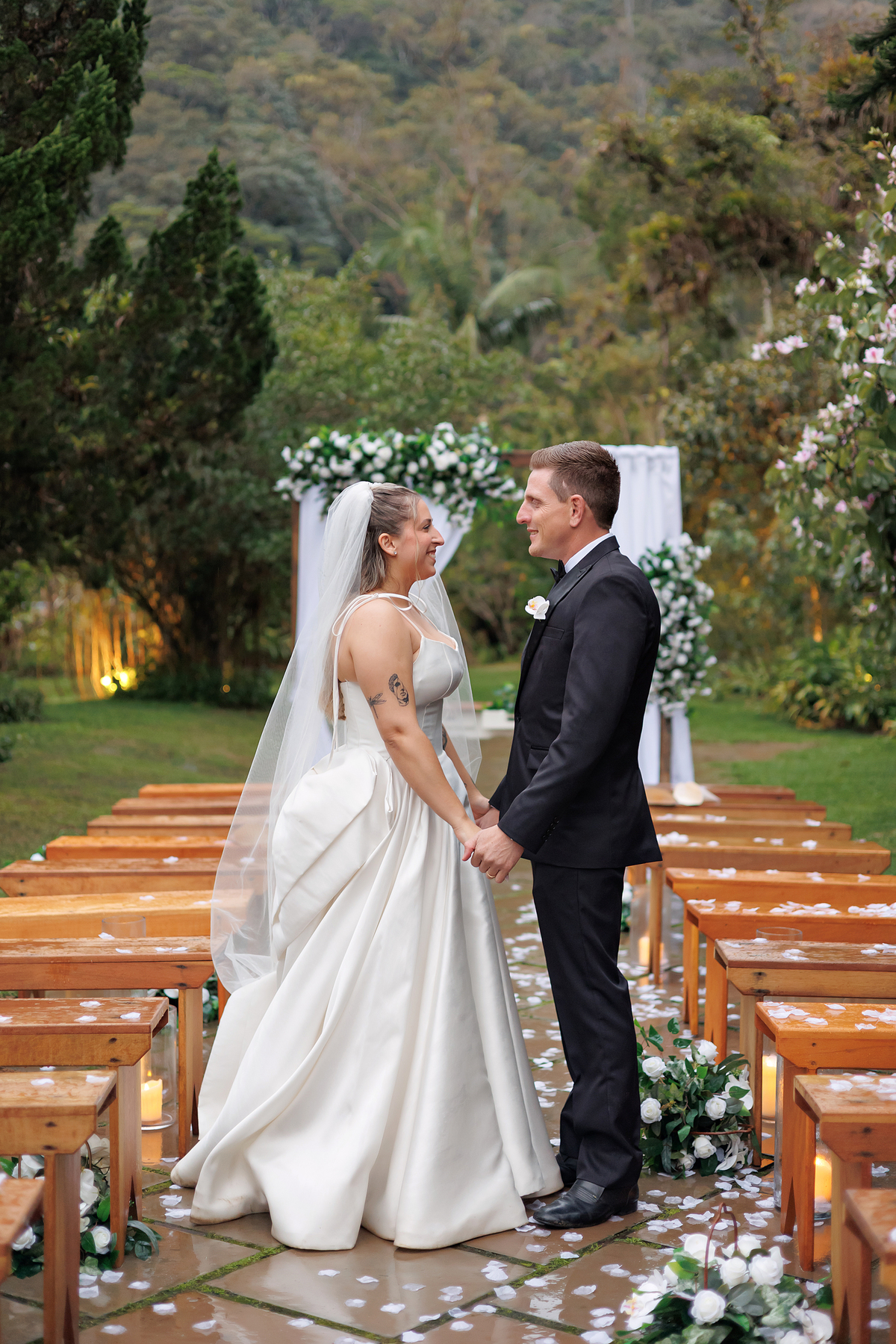 Este não foi apenas um casamento lindo: foi um marco de cumplicidade. Lembremos daquele momento sublime: a chuva chegou, mas o amor… ah, o amor falou mais alto! Patrícia e Luiz, firmes sob o céu, continuaram a ler seus votos, os olhos cheios de certeza, sem um traço de nervosismo. Eles sabiam a profundidade e a força daquele dia que estava sendo selado. Era como se nada pudesse abalar a convicção de que aquele instante era só deles e do “para sempre” que começava ali.